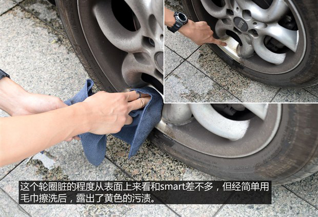 輪圈上的頑固污漬一般分為兩種,黑色污漬和黃色污漬,所以小編就找來了兩輛帶有不同顏色污漬輪圈的車輛,帶有黑色污漬輪圈的smart和黑色+黃色污漬輪圈的MINI。