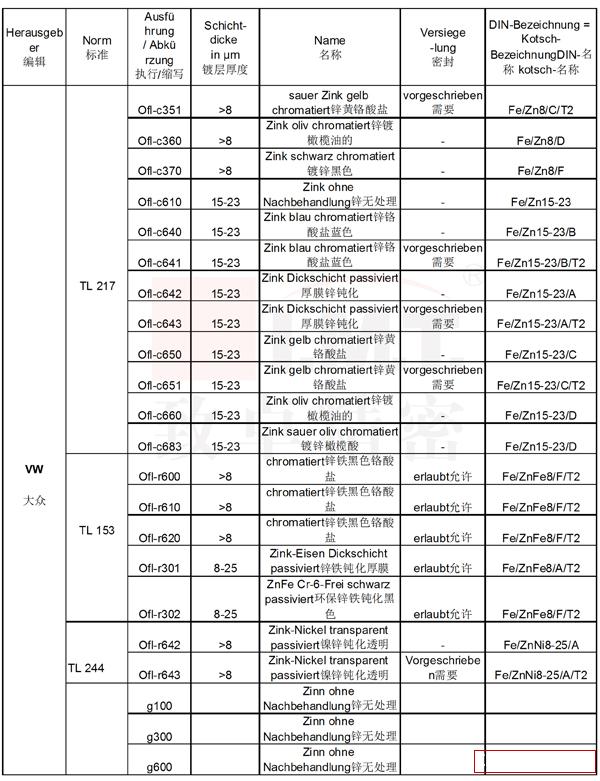 汽車配件涉及的車型多,品種規(guī)格復雜,僅一種車型的配件品種就不下數(shù)千種,各品牌各品種配件表面處理標準也不盡相同。以下為各大德國車企配件表面處理標準匯總。